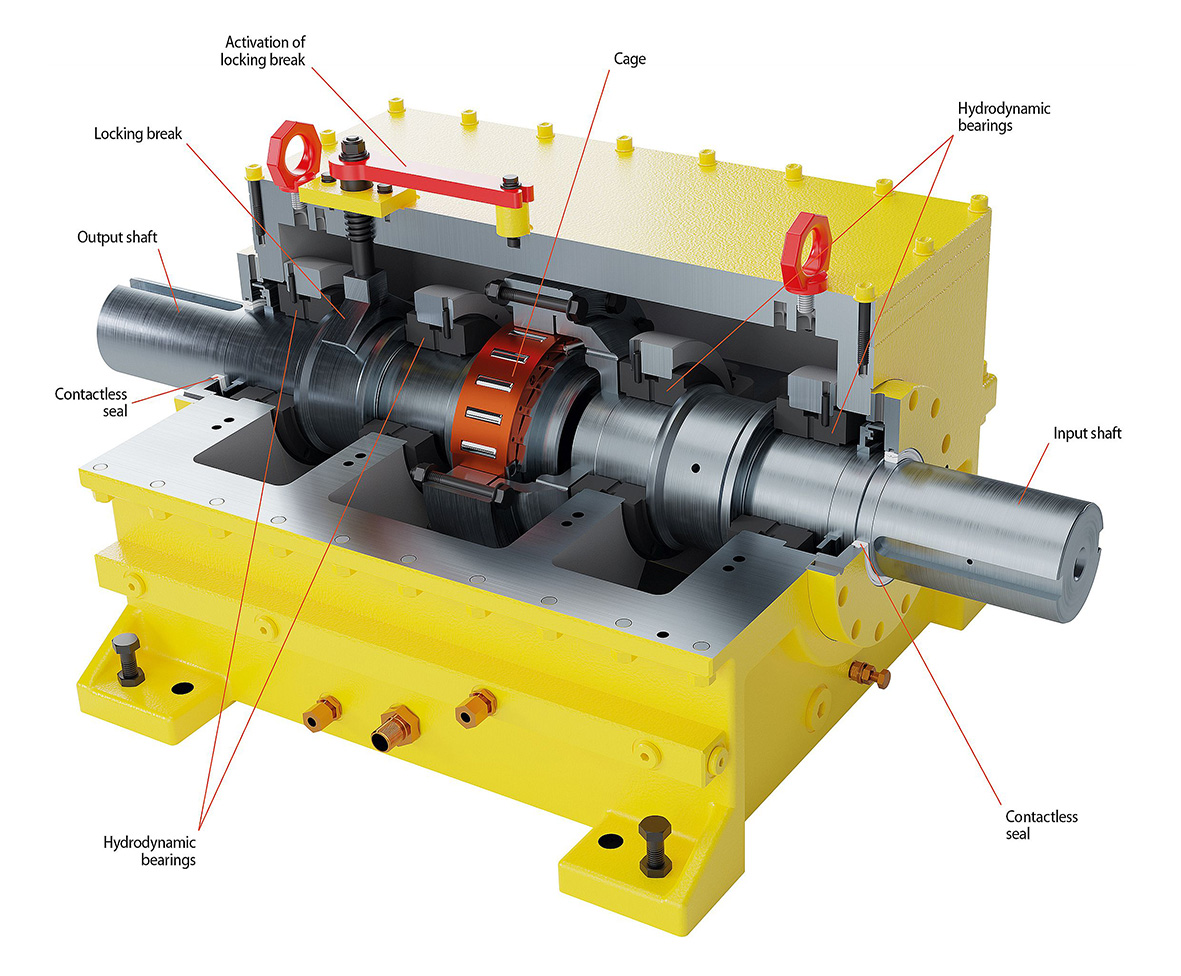 The key design factor for the high-speed competence of the new FHHS housing freewheels is the use of the hydrodynamic clamping roller lift-off. The lifting force is generated by an oil jet guided in the bearing of the freewheel, which allows both high speeds and wear-free freewheeling operation. Thomas Heubach, Head of the Freewheel Division at RINGSPANN, explains: "The relative speed between the inner and outer ring is decisive for the effect of the hydrodynamic lifting of the clamping rollers. If it decreases, the lifting force is also reduced. Even before synchronous running is reached, the clamping rollers, which are guided in a cage, attach themselves to the outer ring race of the freewheel via the central spring and are ready for locking. This ensures immediate load transfer when the synchronous speed is reached." Housing freewheels with hydrodynamic clamping roller lift-off are always an ideal solution when a unit is driven by two or more motors or turbines with the same or similarly high speed. The plant operator benefits from this in three ways: firstly, it can engage or disengage individual powertrain units as required without complex control technology; secondly, it enables process operation without interruption even in the event of a failure of an energy source or a drive unit. And thirdly, it opens up significant energy savings – especially in partial load operation.